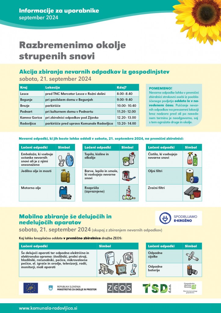 Komunala Radovljica tudi letos organizira akcijo zbiranja nevarnih odpadkov iz gospodinjstev. Potekala bo v soboto, 21. septembra. Skupaj z nevarnimi odpadki boste lahko na ta dan oddali tudi še delujoče in nedelujoče aparate in električno in elektronsko opremo.