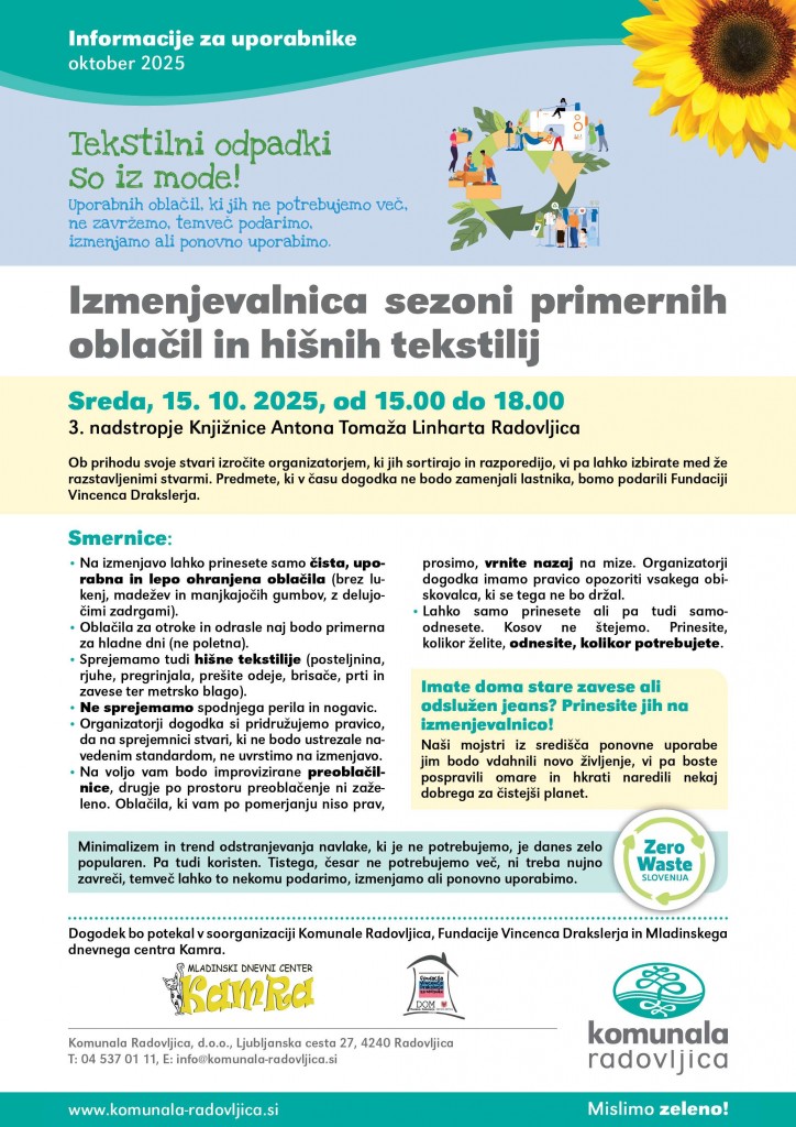 V sredo, 15. oktobra 2025, Komunala Radovljica, Fundacija Vincenca Drakslerja in Mladinski dnevni center Kamra organiziramo jesensko 6. izmenjevalnico oblačil in hišnih tekstilij. Potekala bo v 3. nadstropju Knjižnice Antona Tomaža Linharta Radovljica.