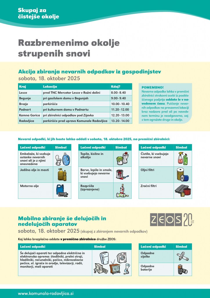 V soboto, 18. oktobra 2025, skupaj z družbo ZEOS, organizira akcijo zbiranja nevarnih odpadkov iz gospodinjstev.