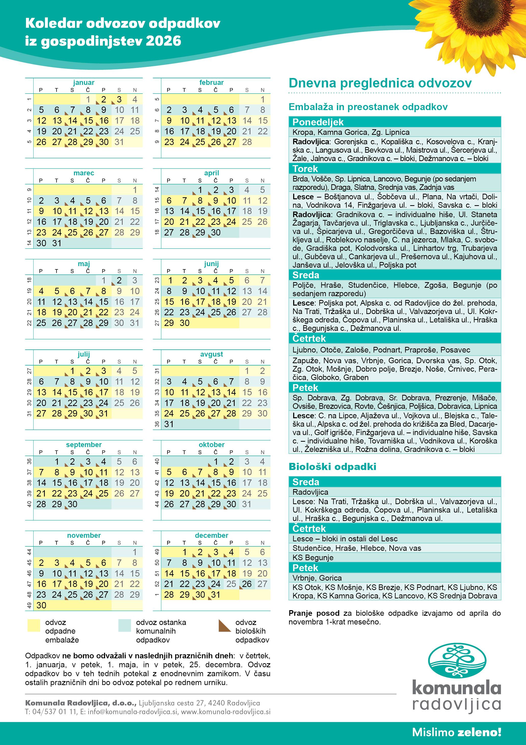 Odpadkov ne bomo odvažali v naslednjih prazničnih dneh: v četrtek, 1. 1., petek, 1. 5., in v petek, 25. 12. 2026. Odvoz odpadkov bo v teh tednih potekal z enodnevnim zamikom. V času ostalih prazničnih dni bo odvoz potekal po rednem urniku.